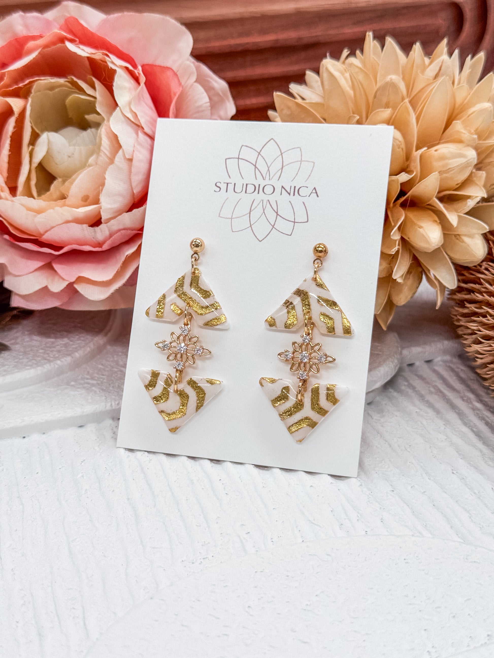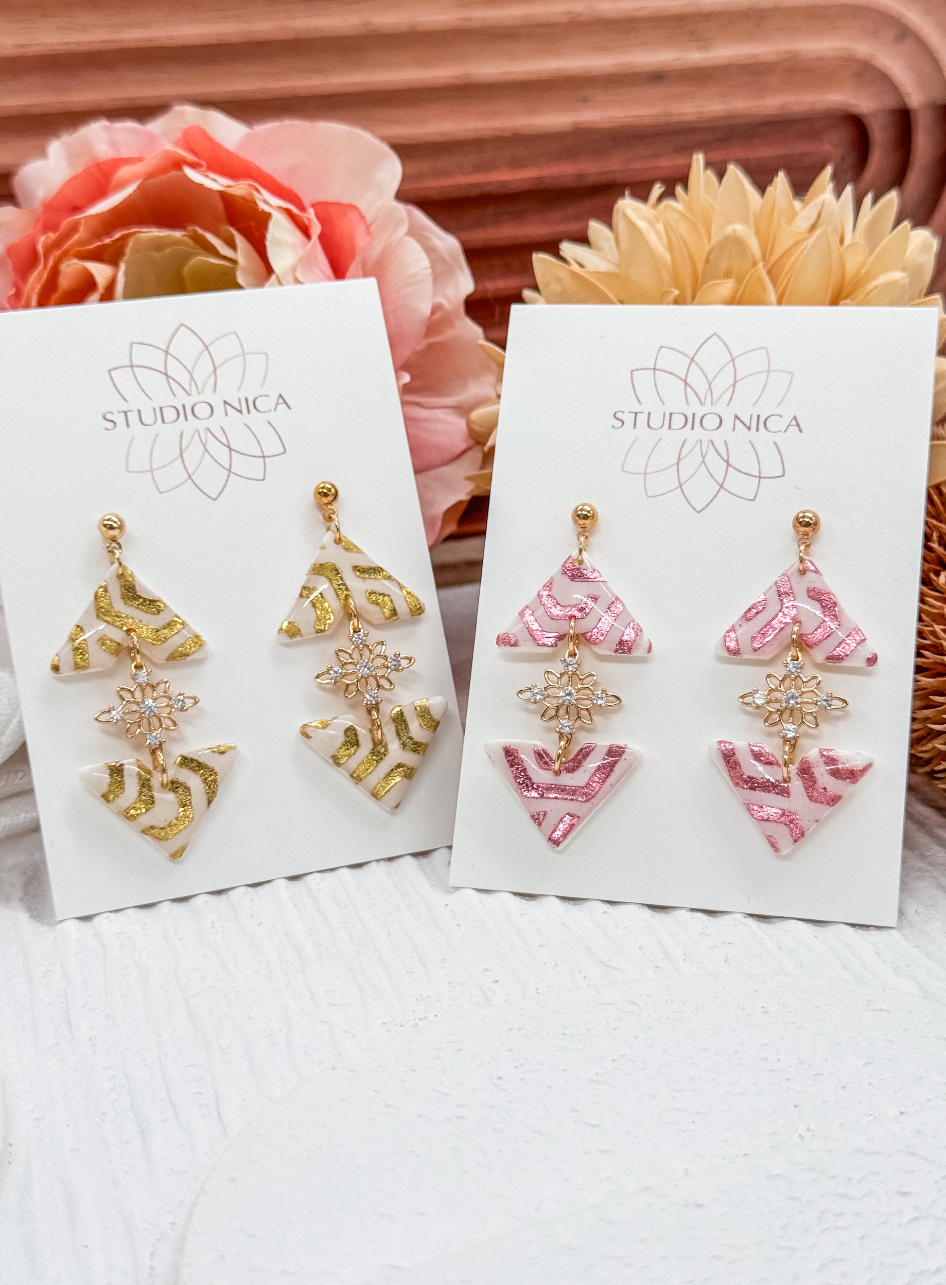 Eleganta och effektfulla hängen i coola geometriska former med metallicmönster. Mellandel med cubic zirconiakristaller. Finns i färgerna guld och rosa.