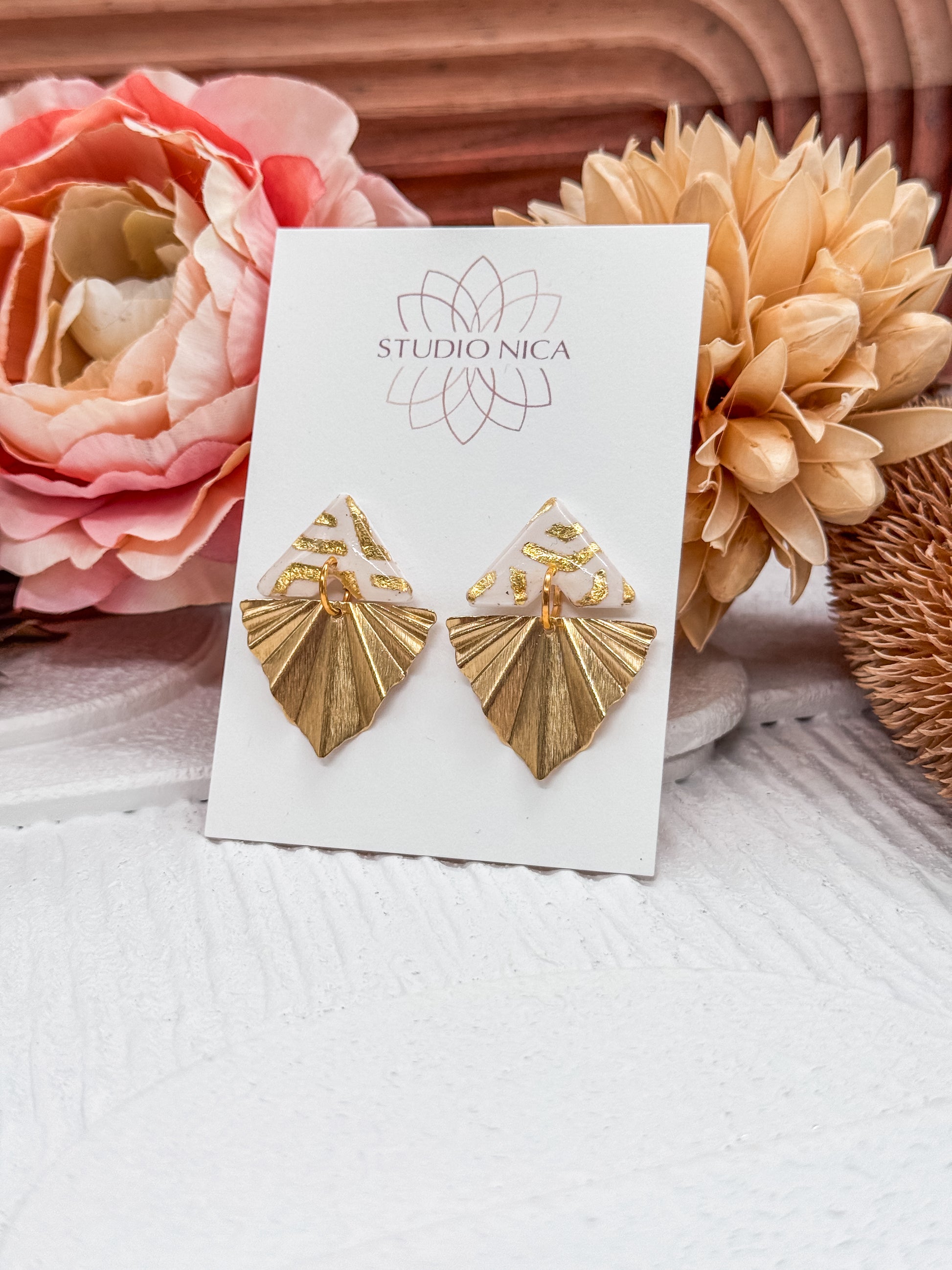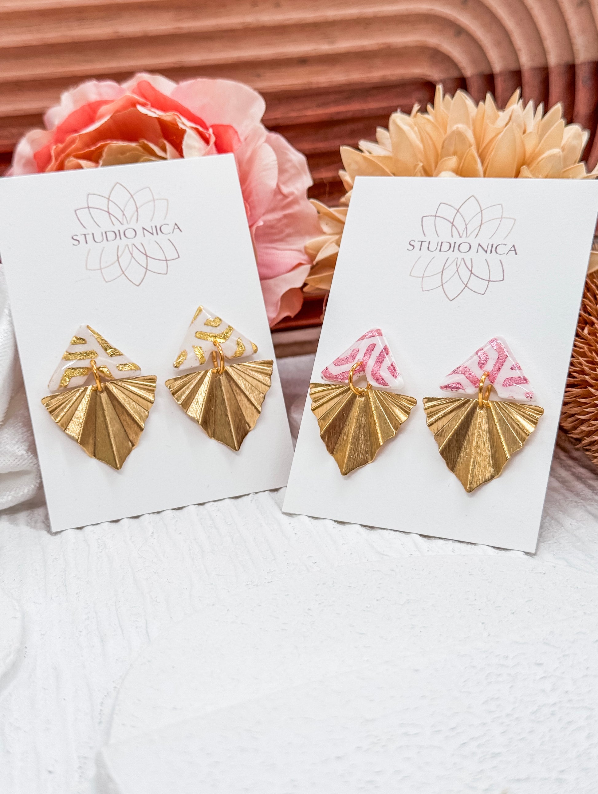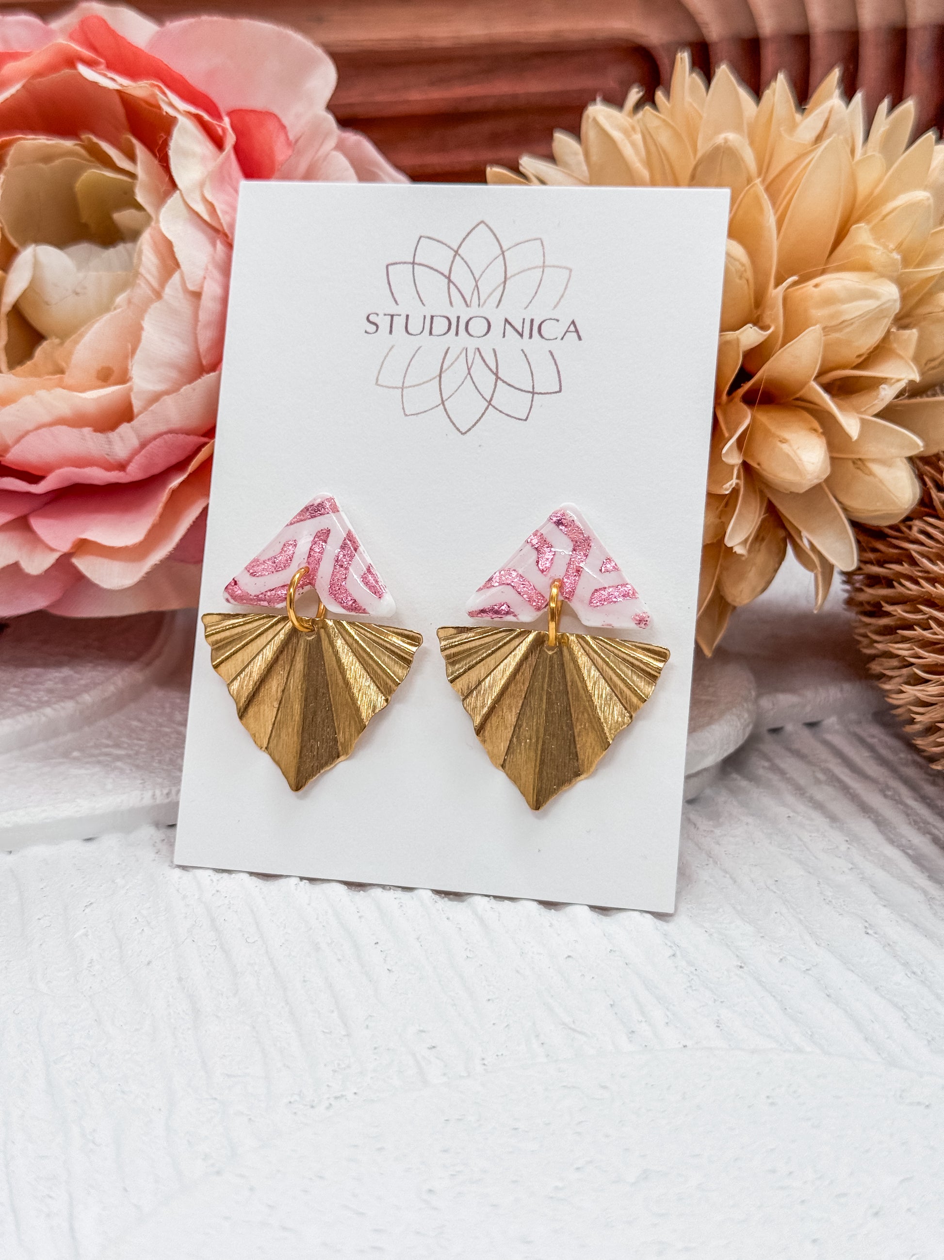 Eleganta och effektfulla hängen i coola geometriska former med metallicmönster. Undertill en formpressad solfjäder i mässing. Finns i färgerna guld och rosa.