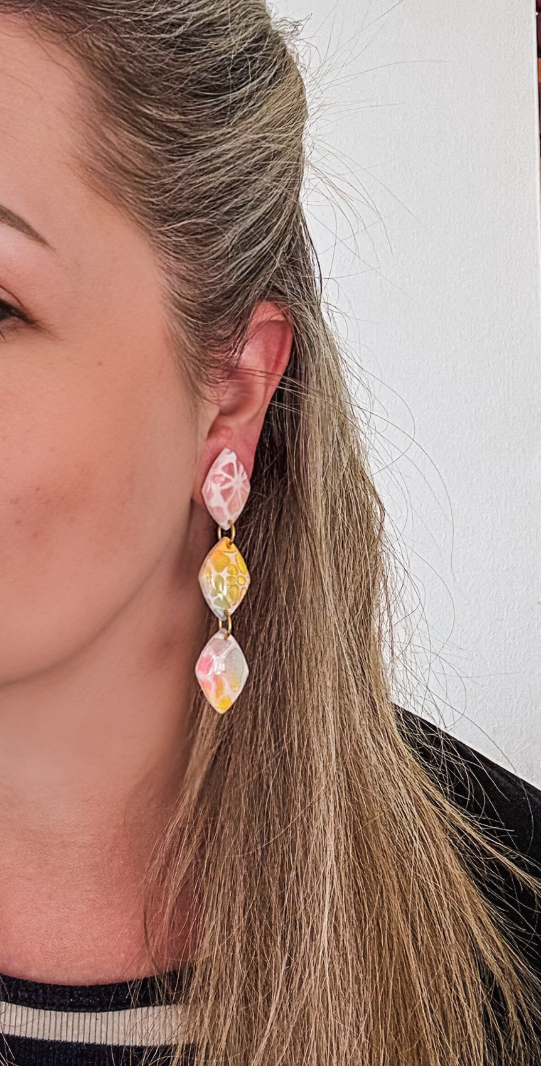 Underbart effektfulla hängen i regnbågens alla pasteller. Och skimmer. Massor av skimmer! Dessa trippelhängen är perfekta för dig som älskar långa örhängen!
