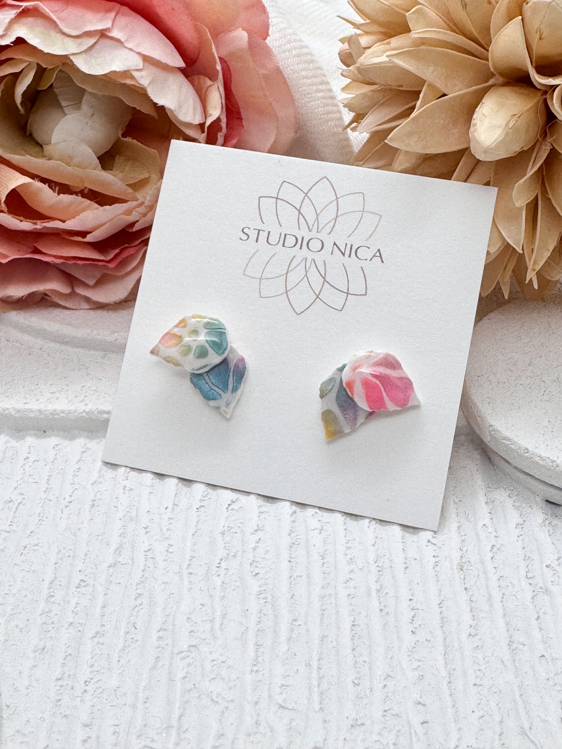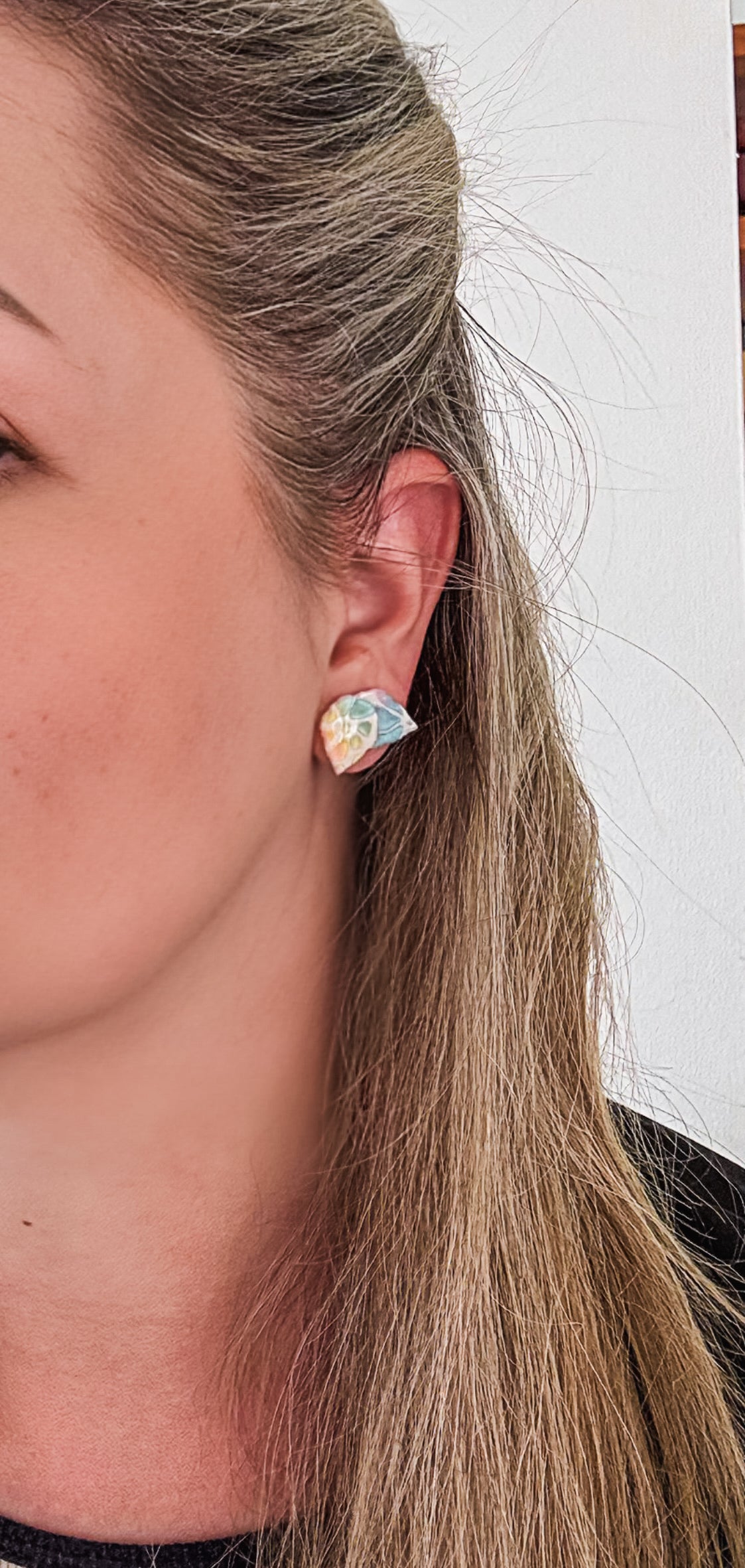 Underbart effektfulla hängen i regnbågens alla pasteller. Och skimmer. Massor av skimmer! Dessa studs har formen av två sammanfogade små blad, och är perfekta för dig som vill ha något litet men effektfullt!