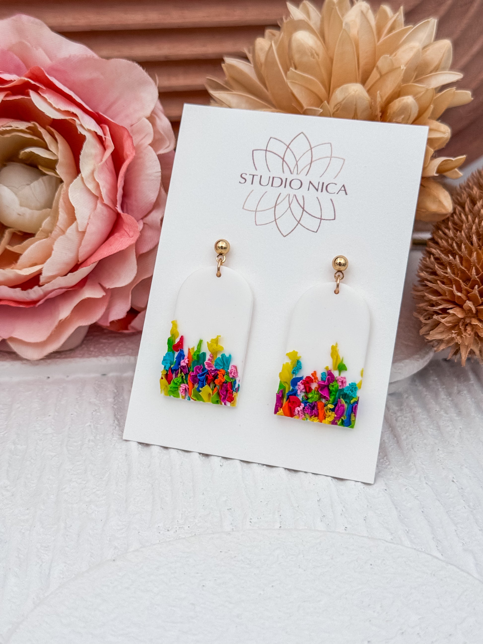 Vackra handgjorda örhängen där prideflammor möter sommaräng. En impressionistisk stil med både struktur och färgglädje.