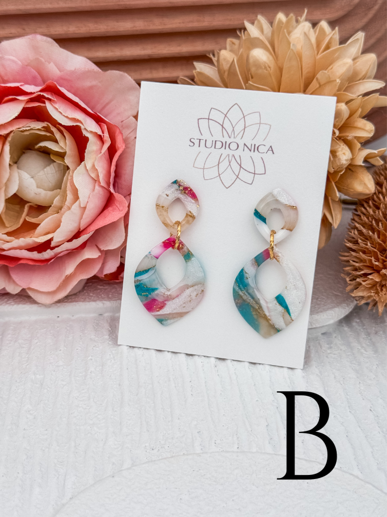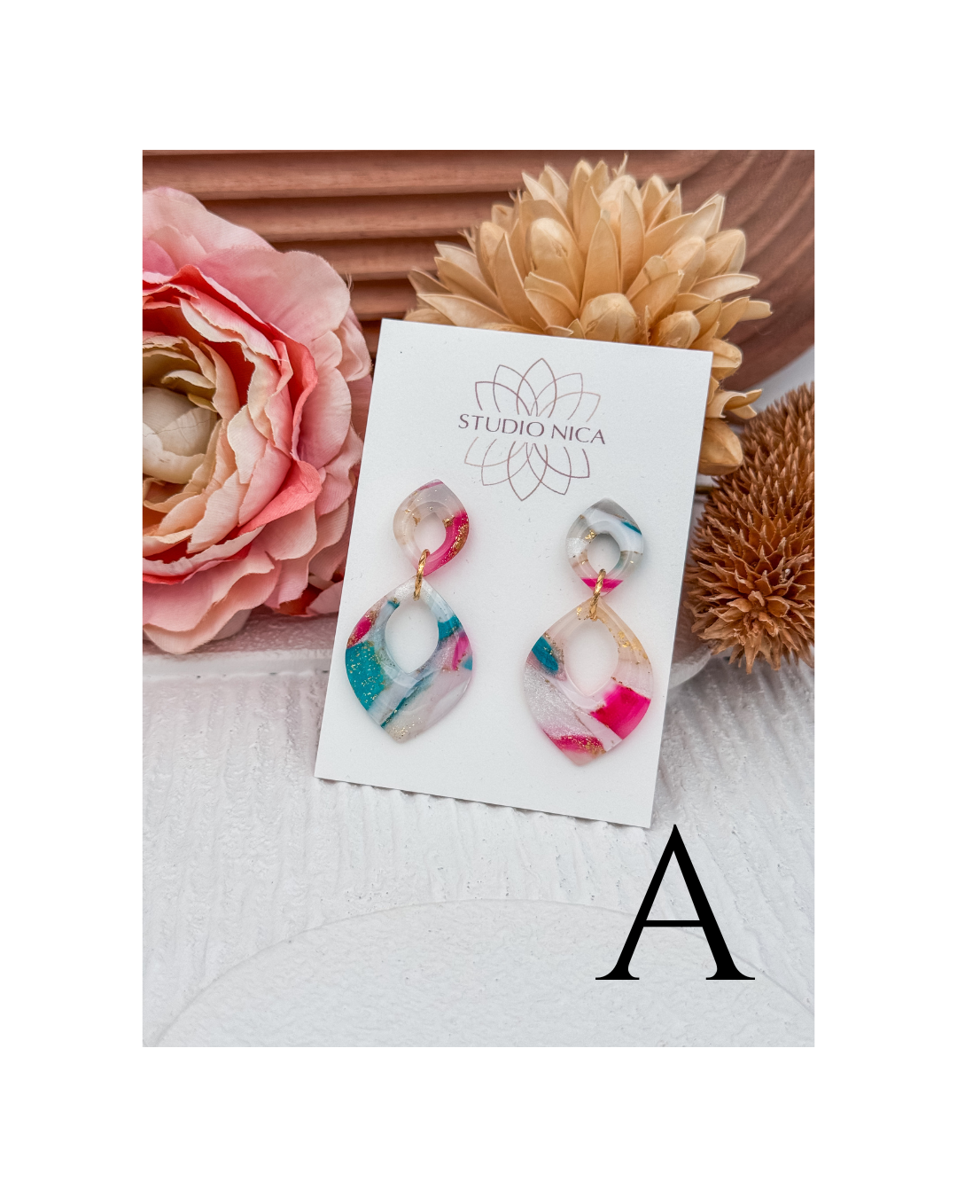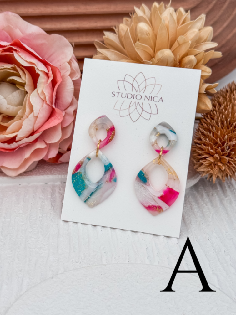 Vackra marmorerade örhängen i fuchsia, teal och vitt, laddade med skimmer och guldstänk. Finns i två olika par.