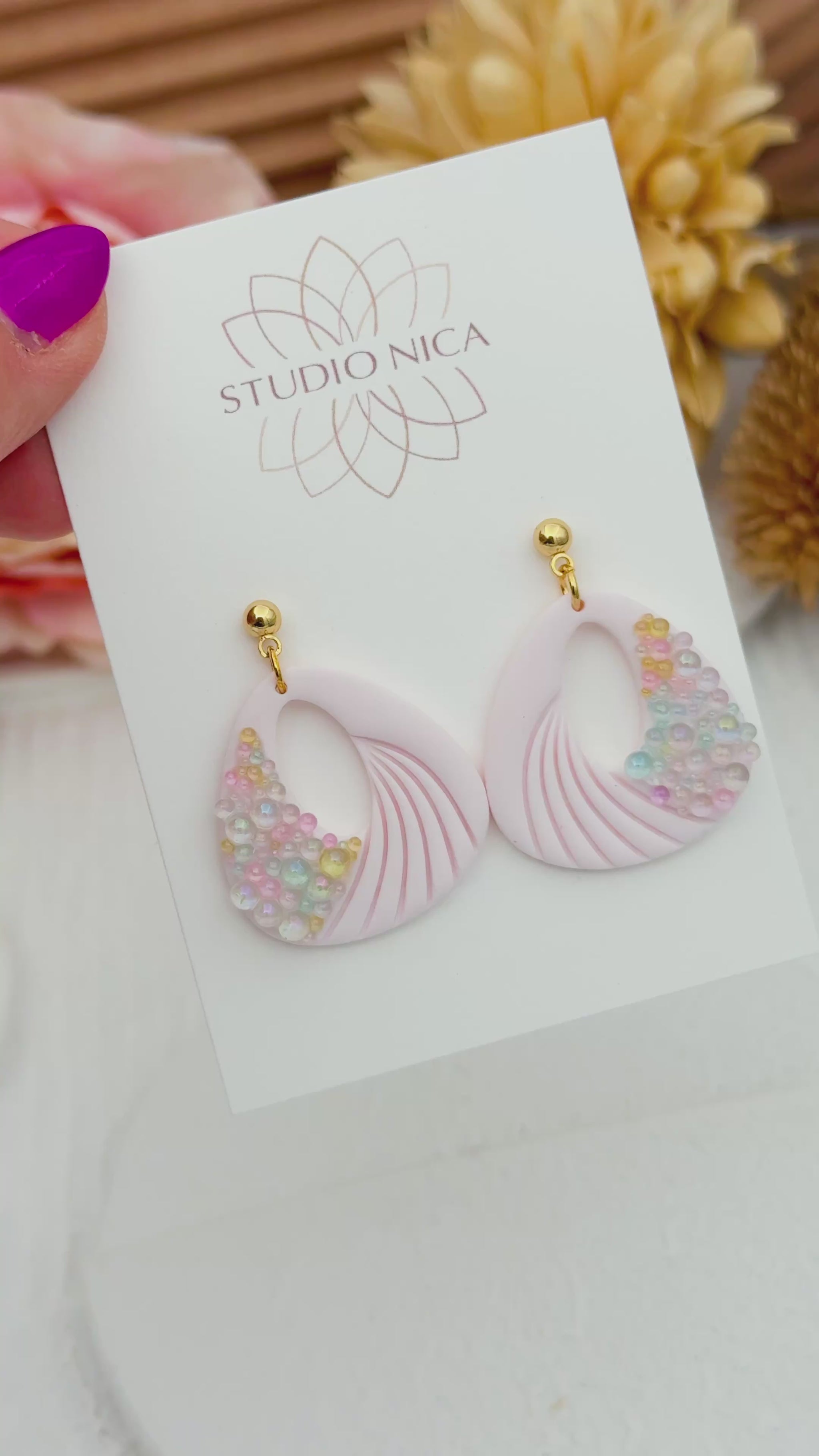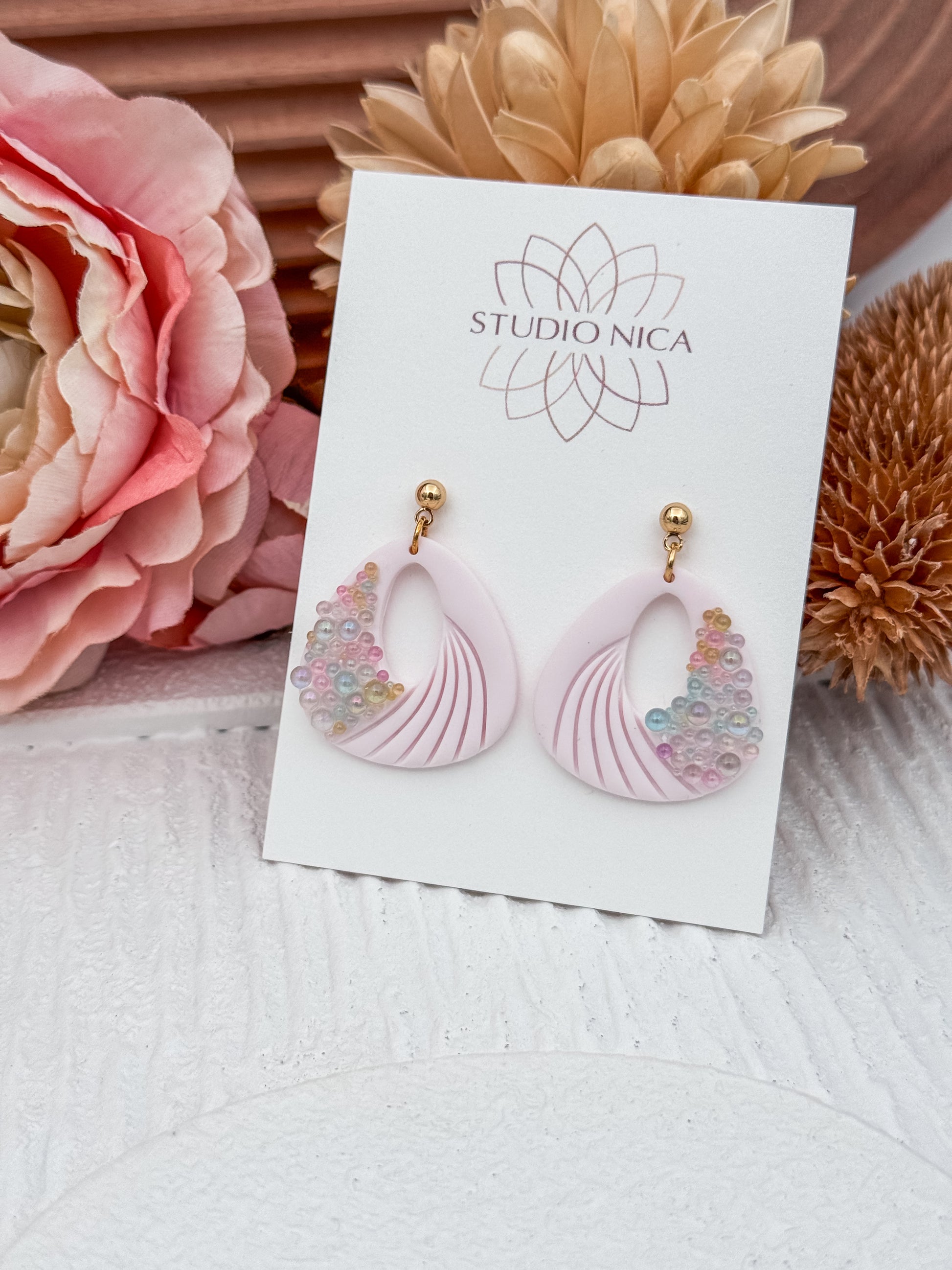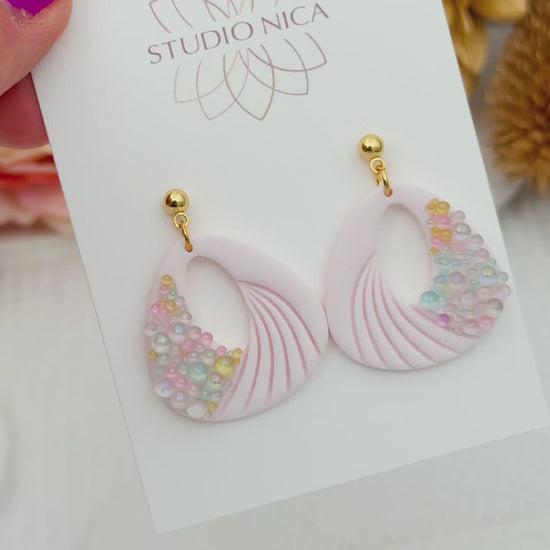 Handgjorda örhängen i ljusrosa med bubblor i olikfärgat glas.